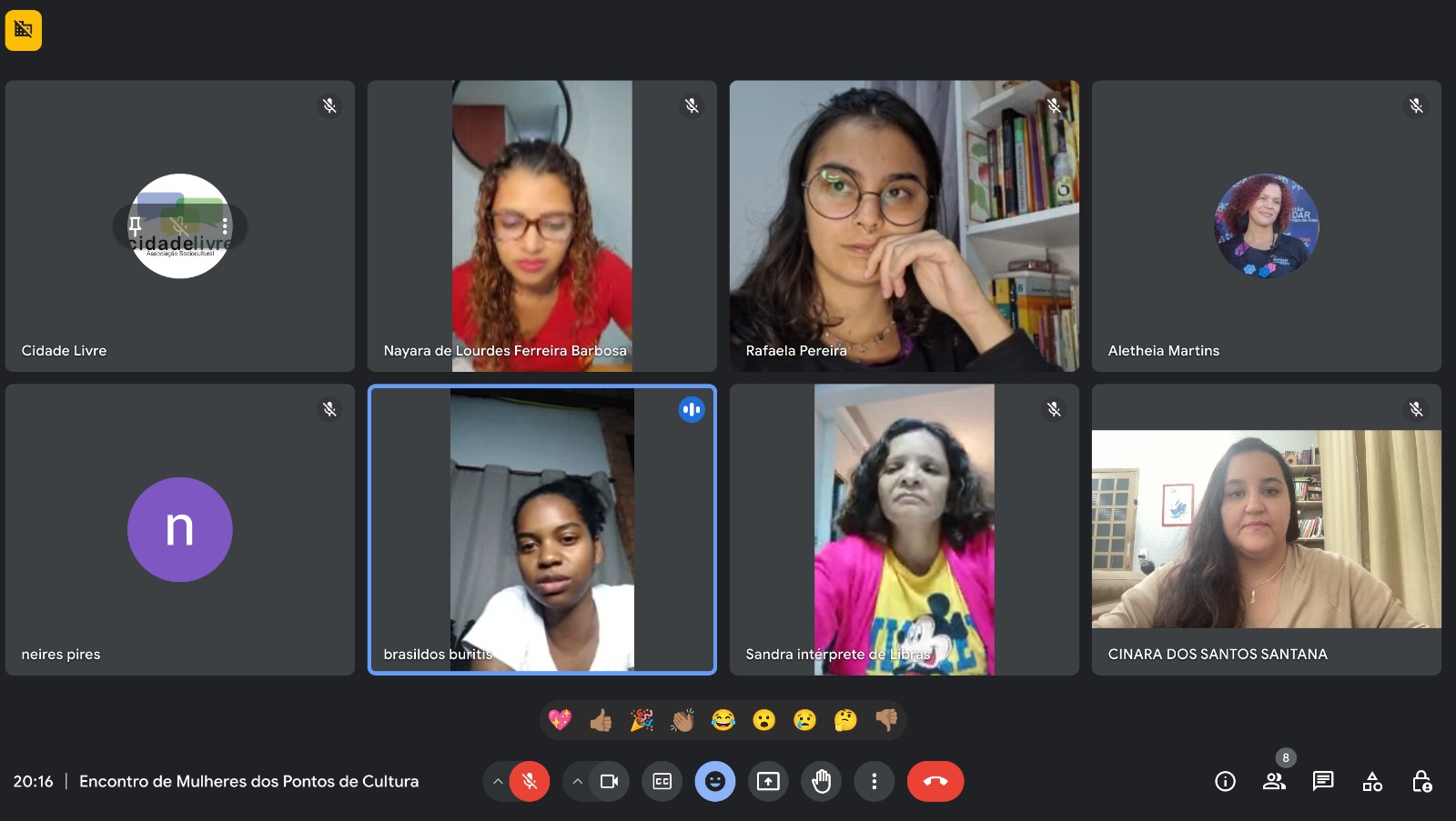 O encontro ocorreu de maneira remota através do aplicativo Google Meet e foi transmitida no Canal do Youtube do Pontão de Cultura Cidade Livre. Reuniu mulheres representantes de alguns Pontos de Cultura do estado de Goiás para debater questões de genero na lida do dia a dia dentro desses espaços. O encontro fortaleceu o vínculo entre mulheres de diferentes territórios, fomentou trocas de saberes, gerou propostas para ações colaborativas e reafirmou a importância da perspectiva de gênero na gestão cultural. As participantes destacaram a relevância do espaço de escuta e articulação, a facilidade de participação pela modalidade virtual e a necessidade de continuidade desses encontros para fortalecer a rede e ampliar a visibilidade das mulheres na cultura de base comunitária.