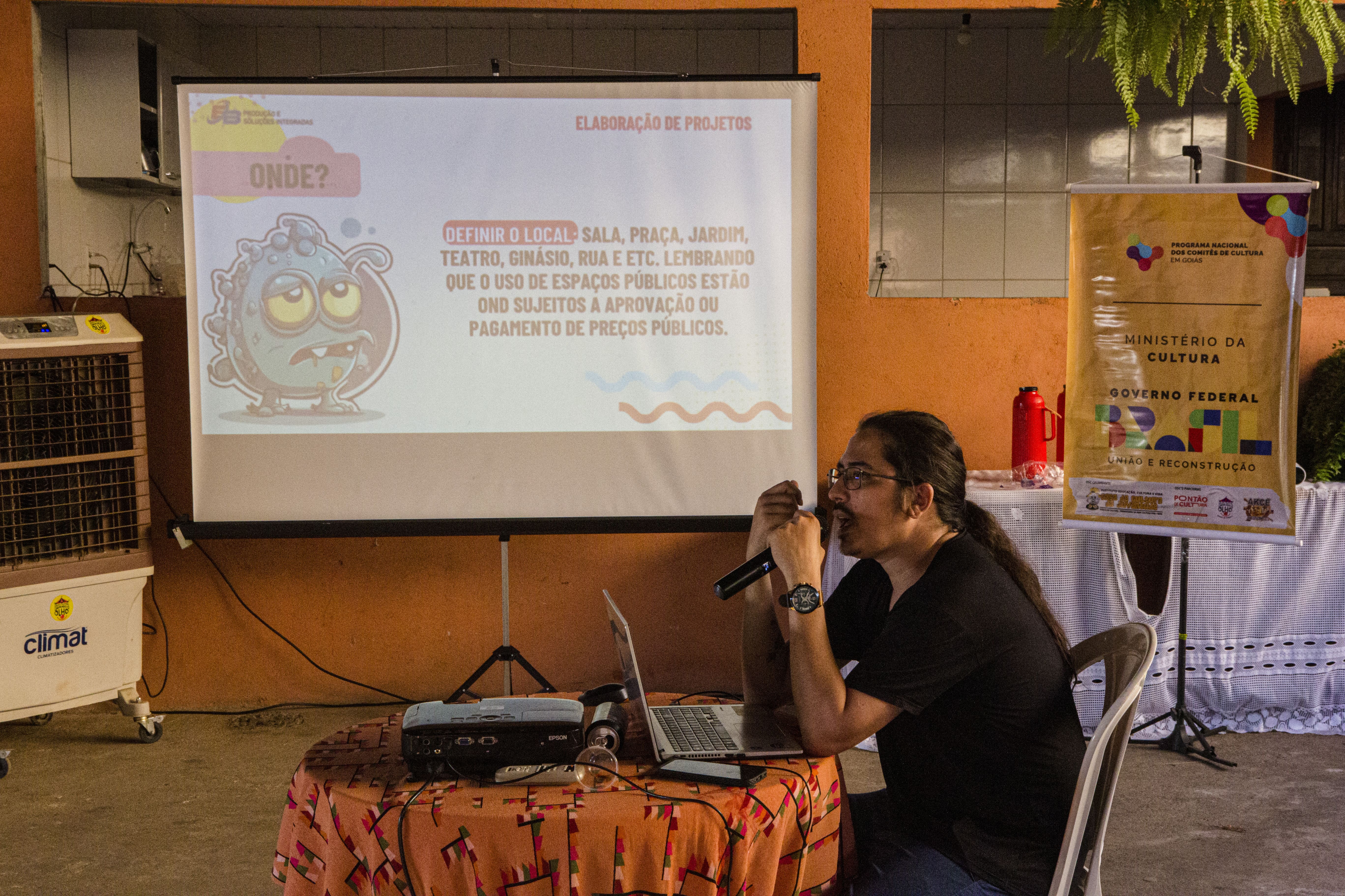 Com carga horária de 3 horas, atividade foi desenvolvida no período das 15h10 às 18h, com o objetivo de apresentar aos participantes os marcos da PNAB, com foco na Instrução Normativa 10, considerando o contexto do território com a forte presença da cultura dos povos quilombolas. Em seguida, como metodologia, o ministrante abordou elementos fundamentais para a construção e elaboração de projetos culturais, com ênfase na temática da palestra. Abordou as documentações necessárias para participação, tanto no que se refere à proposta cultural, quanto às documentações do proponente.
