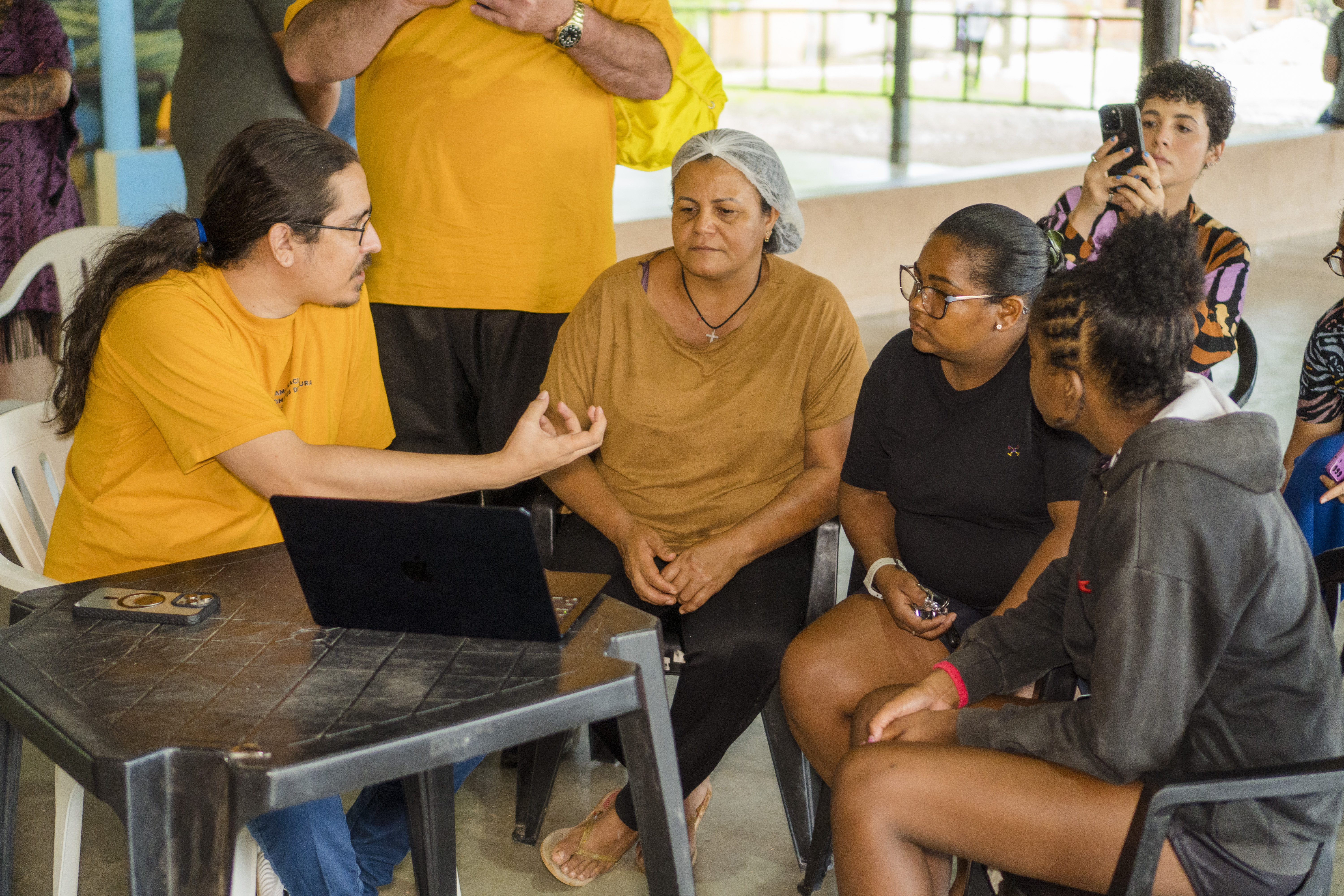 Em seguida, o palestrante apresentou o edital Sabores e Saberes, explicando as formas e condições de participação, o público-alvo e a premiação recebida em caso de aprovação. Com as dúvidas dos interessados, o palestrante reservou parte do tempo prestando atendimento personalizado às representantes da comunidade que atuam na cozinha do Barracão para suporte à atividade turística bastante forte no território. As participantes relataram memórias sobre a culinária local, que foi aprendida com suas famílias e grupos a exemplo da farofa de carne seca.